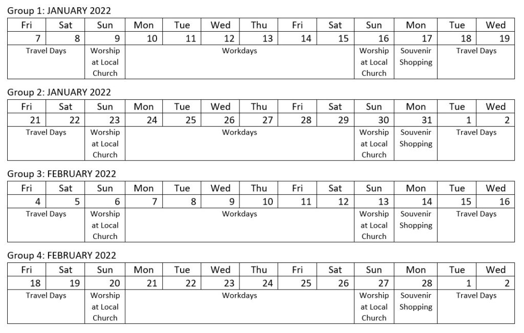 If the Lord wills, we plan to have four 13-day trips in January and February of 2022.
